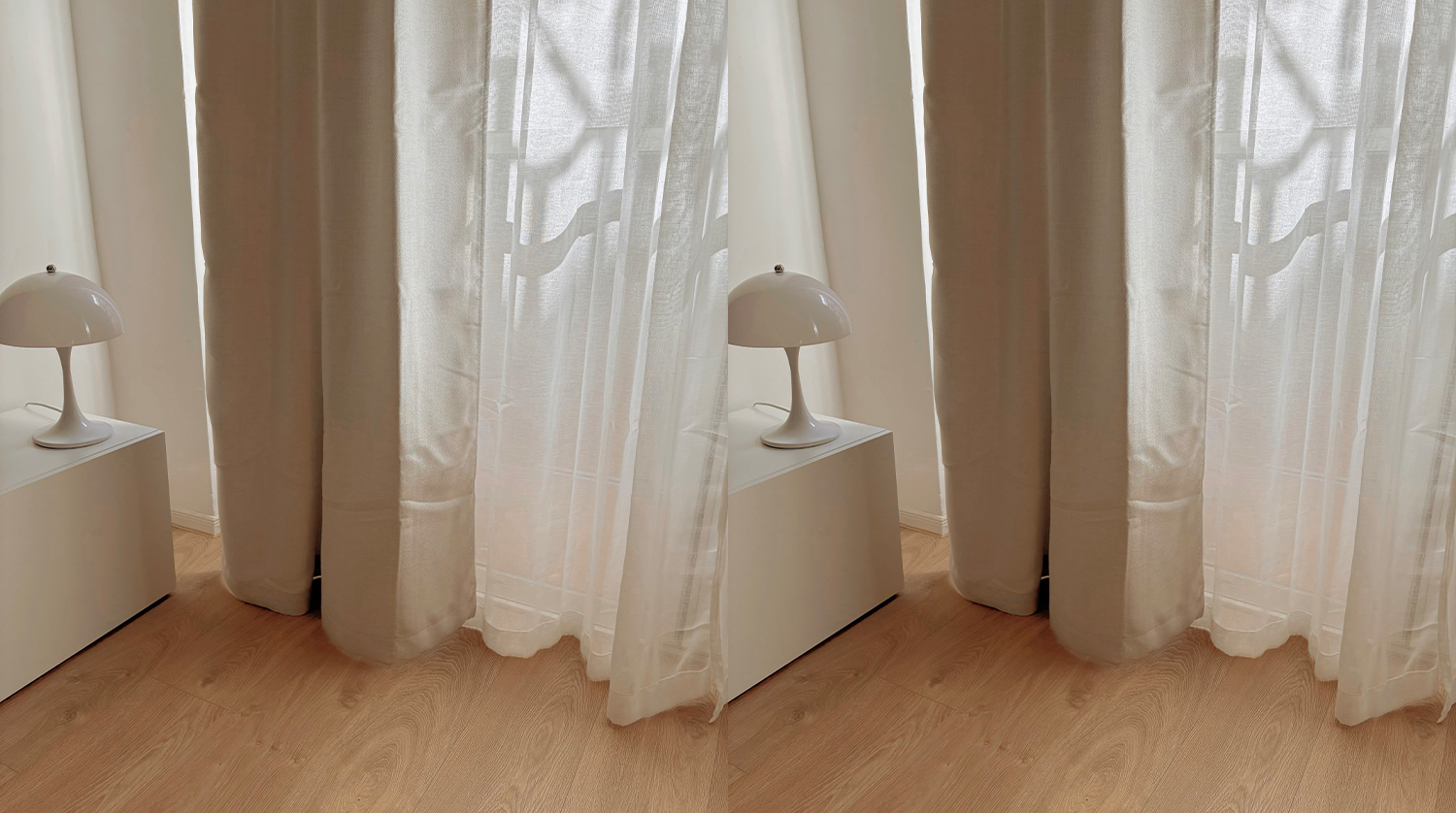 這次選擇了 Lo-Fi Warehouse 的「北歐氣息 Scandi Days」窗簾套組。組合是透光的竹節紗搭配遮光亞麻簾,以白色與淺灰堆疊出清爽的北歐調性。將兩種材質、不同厚度的窗簾用附贈的窗簾環夾上後,空間瞬間變得更安靜、更柔和。喜歡更立體的紋理,也能依照想呈現的皺摺數調整窗簾環的間距。