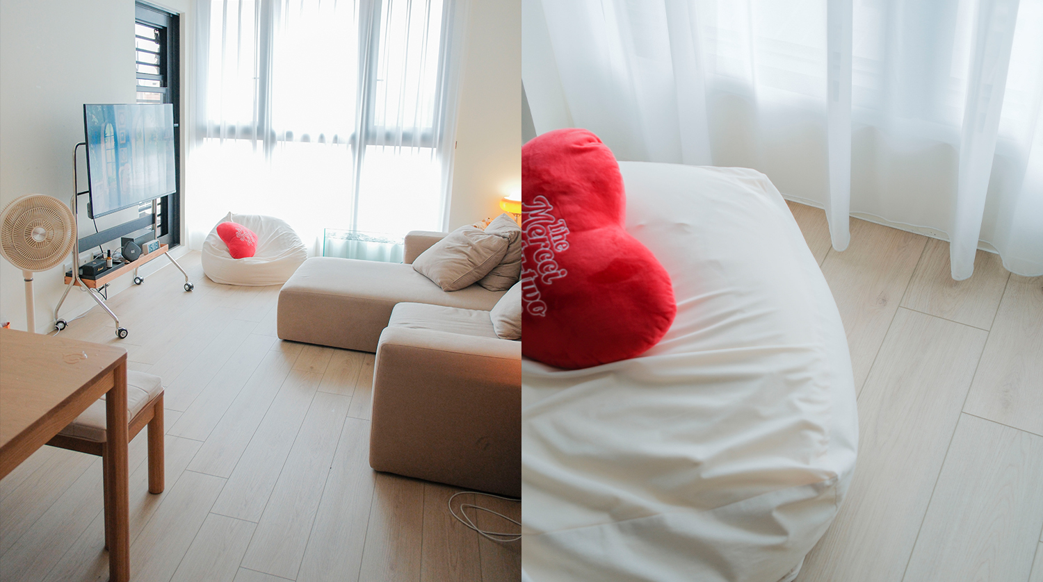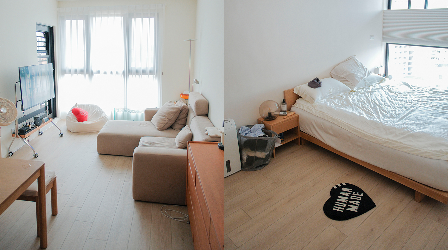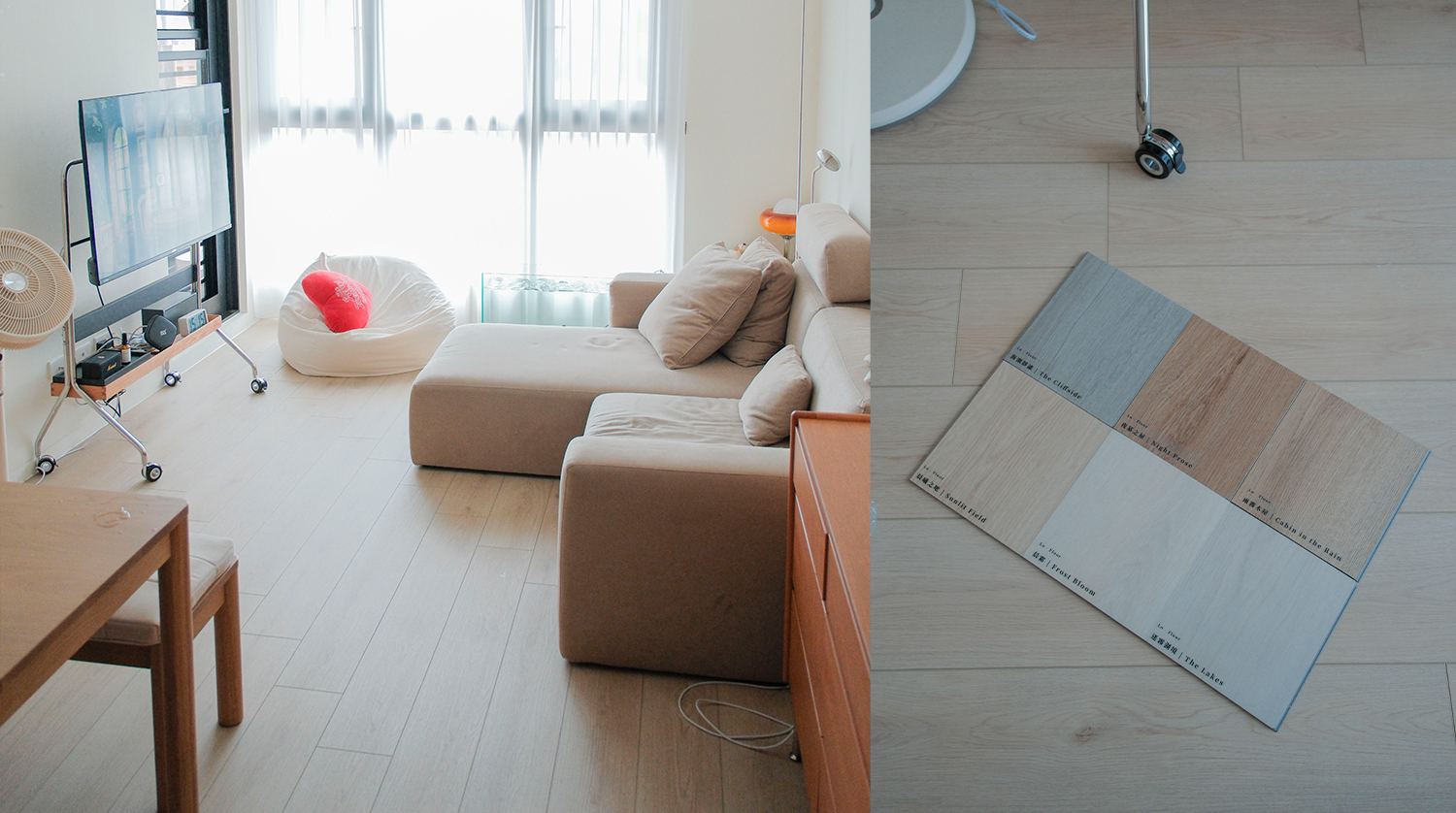 搬進新家後最讓我猶豫的就是地板,從樣板到光線測試照看了無數次,終於選到那款一鋪上就覺得「這就是家」的顏色。空間瞬間升級到理想中的樣子,實在太滿意!