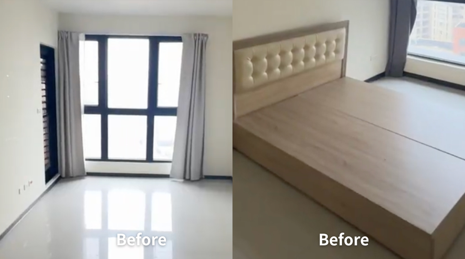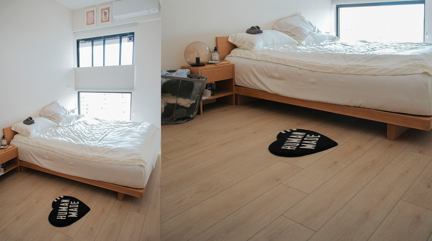 會選它還有一個很關鍵的原因:木紋細節真的很好看!拍照非常上相,色調不會偏黃也不會過度灰。師傅實際安裝時也說這款扣扣地板很好施工,卡扣穩、拼接順,整體鋪起來比我想像中更快。而空間一鋪好,質感直接往上拉了好幾級,是那種立刻看見差異的變化。