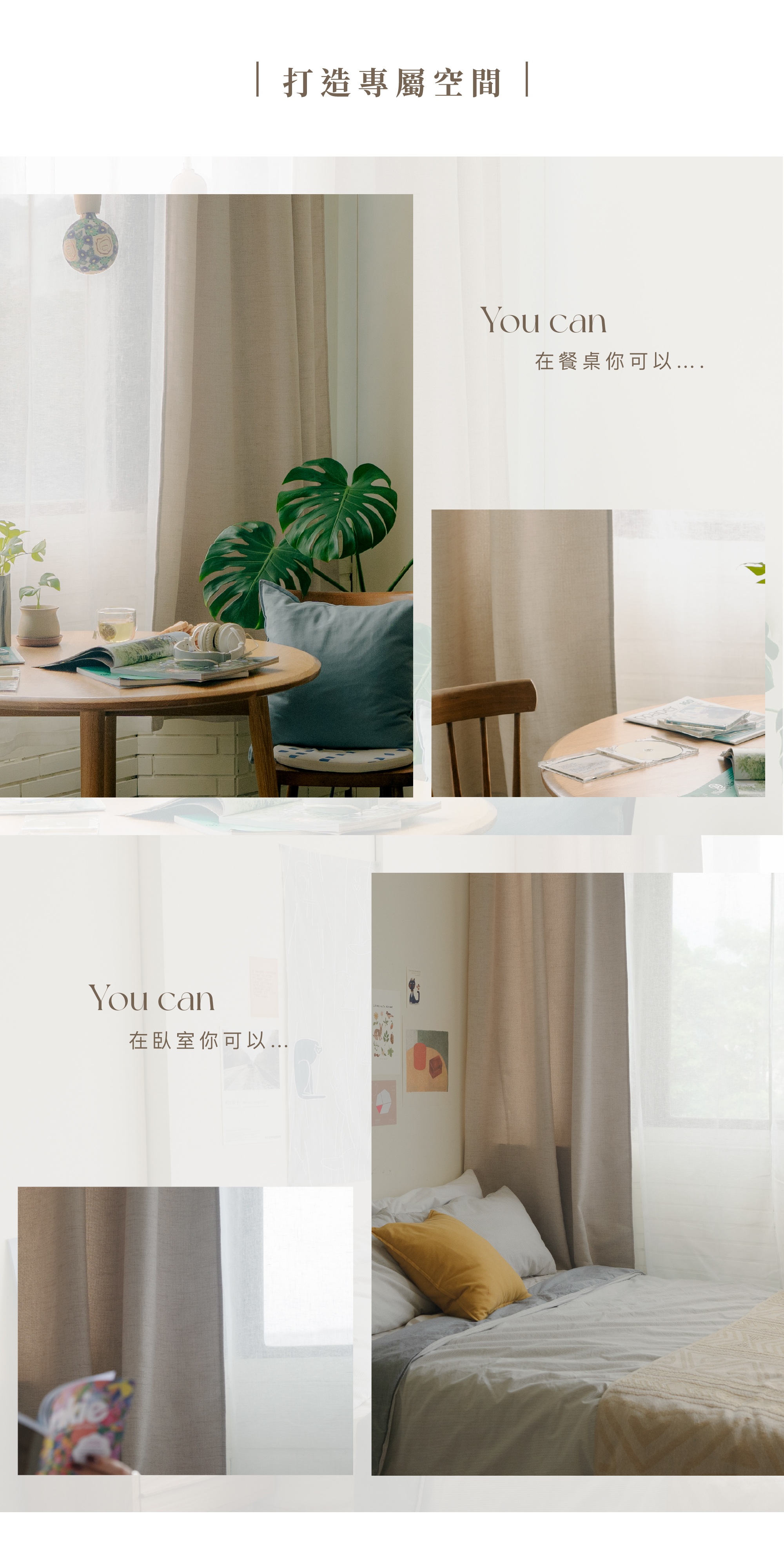 ・風格套組:一布一紗兩種材質各含兩片,共四片窗簾